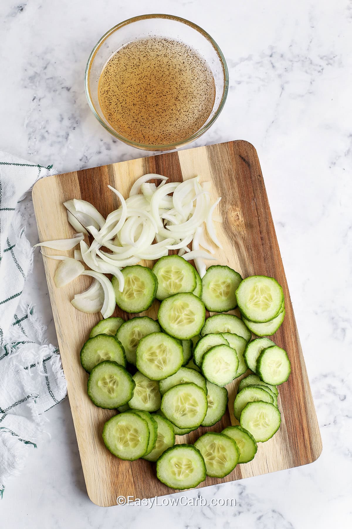 - Wash cucumbers and pat dry. Slice cucumber and onion, then place in a large bowl.