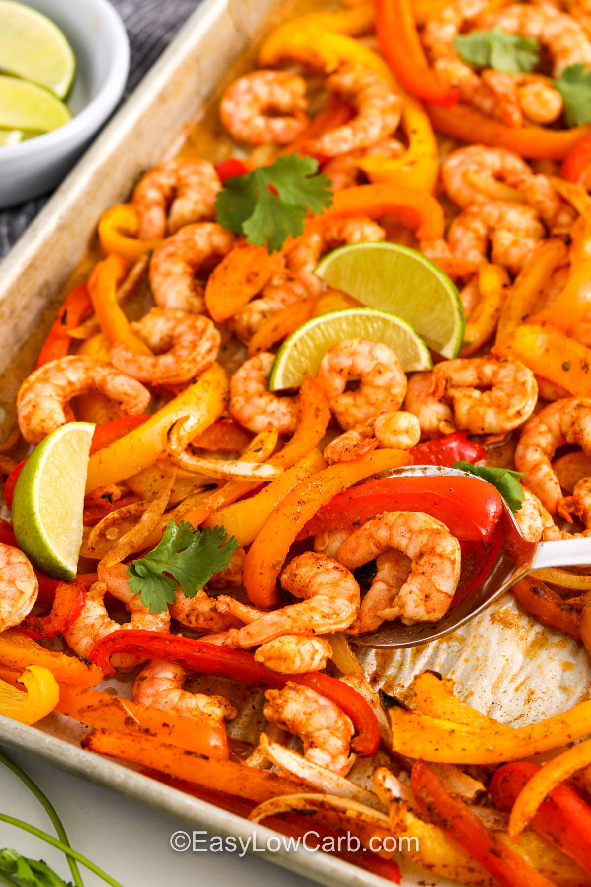 - While veggies roast, toss shrimp in a bowl with the remaining 1 tablespoon olive oil, remaining fajita seasoning, and lime juice.